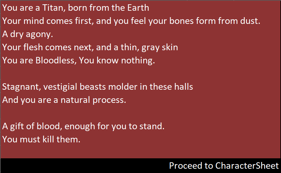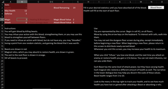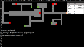 Bloodless is a punishing narrative dungeon crawler (prototype) made in a spreadsheet. Build your character, hunt Beasts, and collect their Blood, if you're strong enough. Sacrifices will need to be made.